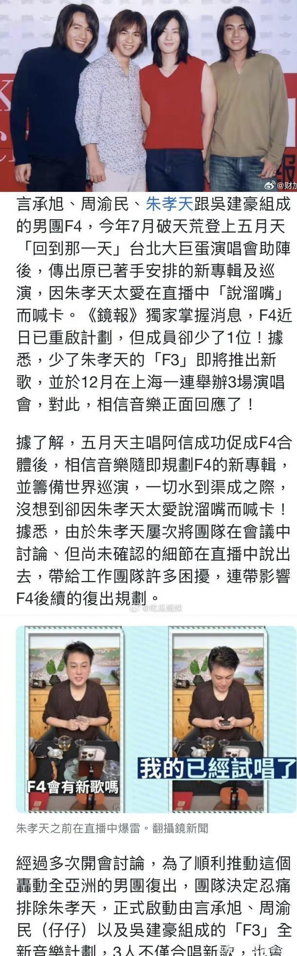 近日,大家期待已久的F4出道25周年巡回演唱会迎来最新消息,连时间和第一场的具体地点和安排都已经定好了。可随后官方发了一则通告,说这次巡回演唱会只有F4中的言承旭,吴建豪,周渝民三人参加,朱孝天赫然被排除出局。啊,F4瞬间变F3,这也行?!这是朱孝天的“报应”吗?